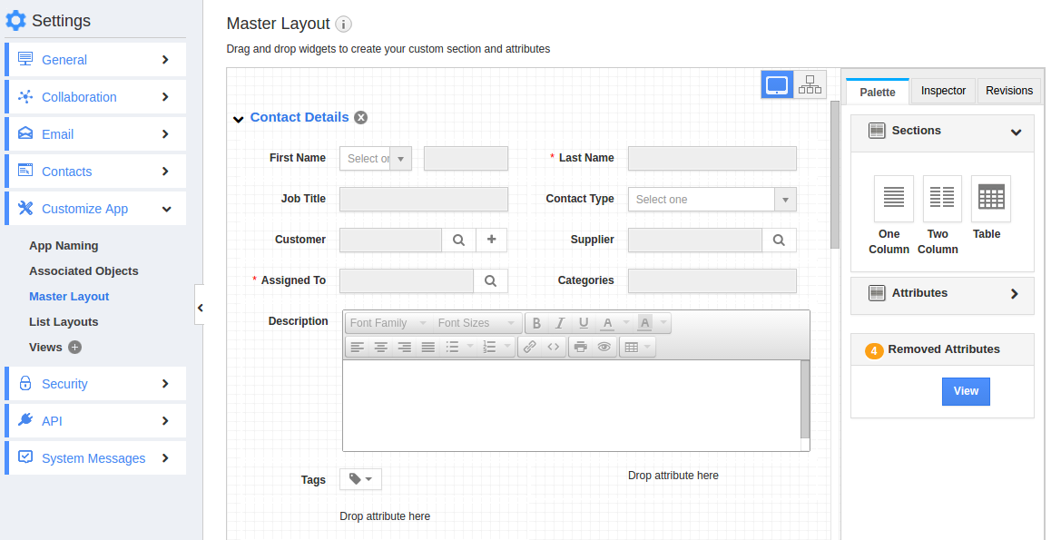 Apptivo gives you the tools to customize each app per your business needs. You can add, remove and/or rename any field in the app. There are many different types of attributes to add such as radio buttons, date fields, drop downs and much more.
