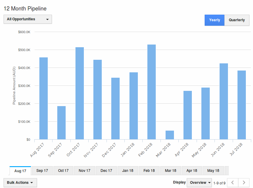 You will be able to visualize the entire sales pipeline stages for the next 12 months that helps user to be organized and make more effective follow ups. The value proposition to the next near future will be more effective to win more deals.