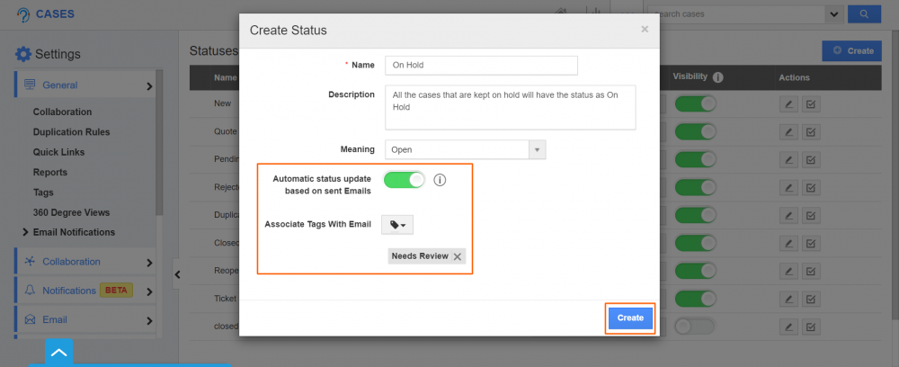 The case status can be updated manually or automatically in the cases app. Now we have gone a step further and introduced an option to have the case status updated automatically while sending an email directly from the Email compose page. Along with this, you can also get global tags associated with the email automatically after the email is sent. You can achieve this by enabling the toggle and selecting the required tags as per your business needs. Thereby, you can send an email, update the status, and associate tags to the email, in the Email Compose page of a case with a simple configuration. Learn more