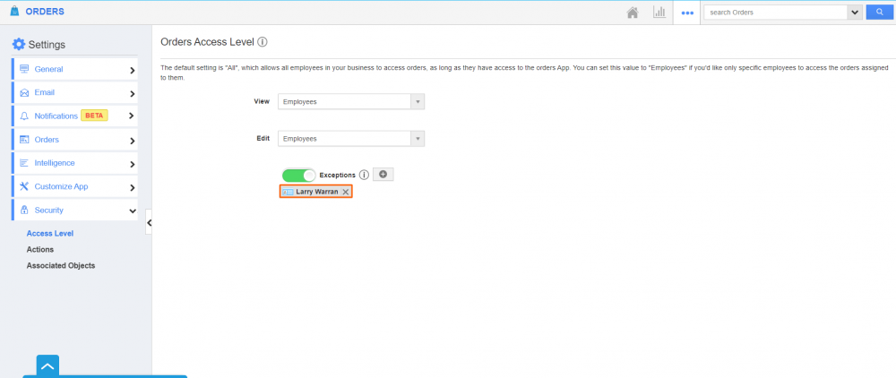 Apptivo provides a variety of security-related features to keep your company data from being exploited. One of them is Access Level, which allows you to provide controlled access to your employees/users. By using this feature, two types of access can be provided to the employees – View orders and Edit orders. You can even add exceptions so that the employees who are added as Exception could access orders with ease. These are customizable, you can update them whenever you need, as per your business needs and preferences. Read More