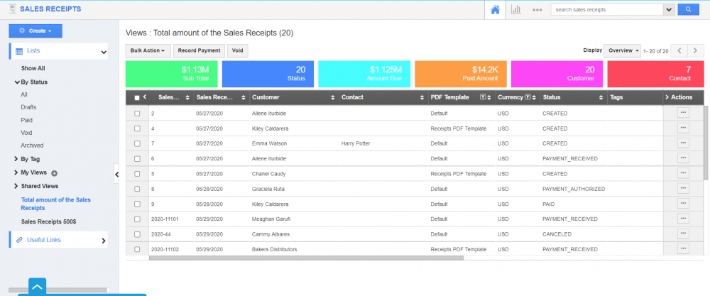 Maintaining the summary of records helps businesses to analyze the progress of their data in less time. It would be easy for you to keep track of your records frequently. Summary boxes will provide the summary of records in sum, count, and average. Create your own view with summary boxes and get the view on the left panel view. You can create up to six summary boxes by providing different criteria to meet the needed scenarios and get insight into your sales receipts. Read More