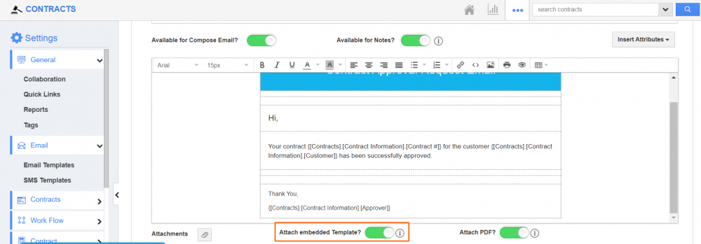 The Contracts app of Apptivo enables you to manage all your contacts according to your business purpose. Furthermore, you can send your contracts for review and make changes as per the requests provided. In this update, we have introduced Embedded Templates in the Contracts app. With this feature, you can easily embed your contracts while emailing the contract to the customer. You can customize this feature from the Email Templates section on the Settings page of the Contracts app. Read More.