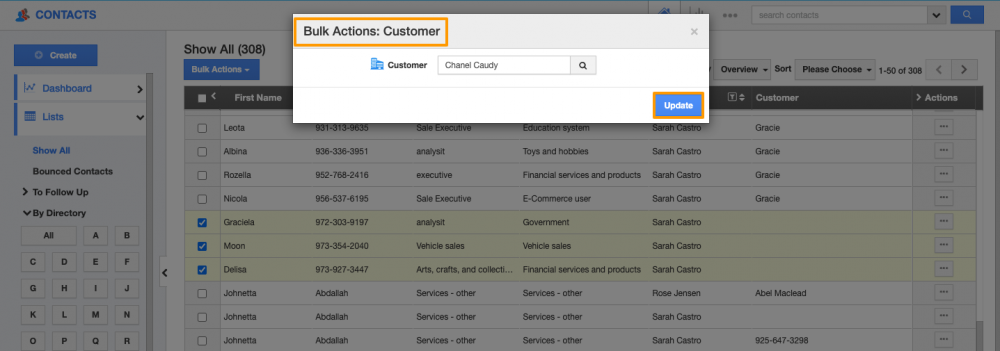 Bulk Update in Apptivo allows you to update the records in bulk without any hassle. In this update, we have introduced the Customer data update in the Bulk Update actions for our Contacts app. It helps in updating the customer details for multiple records simply by using the bulk update under the bulk actions. With that, you can easily search and select the customer name while updating the data using the bulk Actions from the home page of the Contacts app. Read more.