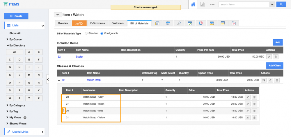 The Apptivo’s Items app helps to efficiently automate the inventory process of your business. It also allows you to create and manage the configurable items based on your business requirements. This helps you to easily reorder rows in the table’s lists of classes & choices according to your needs. You can rearrange the table rows by simply dragging and dropping the rows on the list. On the Bill of Materials tab of the Items app, you can rearrange the table rows once the classes and choices for the items are added to the tables. Read more.