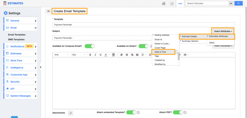 Email Templates in Apptivo allow you to create and customize the predefined messages by simply using the insert attributes link on the email templates. In this update, we have improvised the email templates to support the Time and Date & Time attributes. This helps you to include the custom added Date attribute with the type of Time and Date & Time. You can easily add the Time and Date & Time attributes in your email templates by simply using the insert attributes button while creating a new email template. Read more.