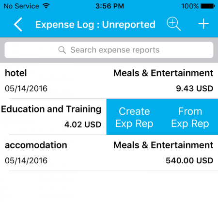Usually the unreported expense reports are saved under the under this category. Wherein the expenses reports needs to be generated with the expenses and sent for the approval. Once you swipe on any one of the unreported expense two options will be displayed i.e, create expense reports or from expense reports. While you select the create expense report the new expense report page will be opened and you can give the necessary details and create it. For the from expense report option it will list the already created expense reports and you can select any one which you wish to add it to this expense.