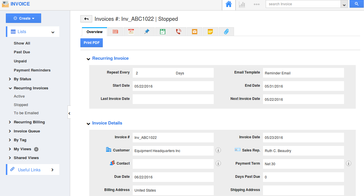 Owning a small business often means you need to send invoices on a repeated basis. Users can send recurring invoices to the customers that are created on a pre determined schedule, using the Apptivo’s online recurring billing system. Recurring invoices work with your schedule to make sure the invoices are paid on time, every time.