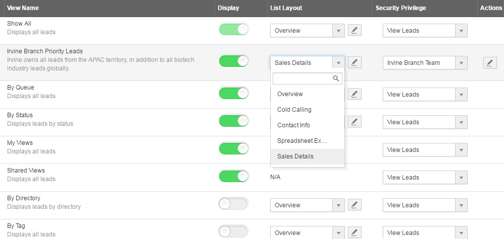 A few months back, we introduced a new “View Builder” tool into the Cases App, and we’ve received very positive feedback. This release we introduced the same feature into our Contacts, Leads, and Opportunities Apps (customers will come next release). This feature is available only to administrators, and appears as part of the existing “Views” settings.