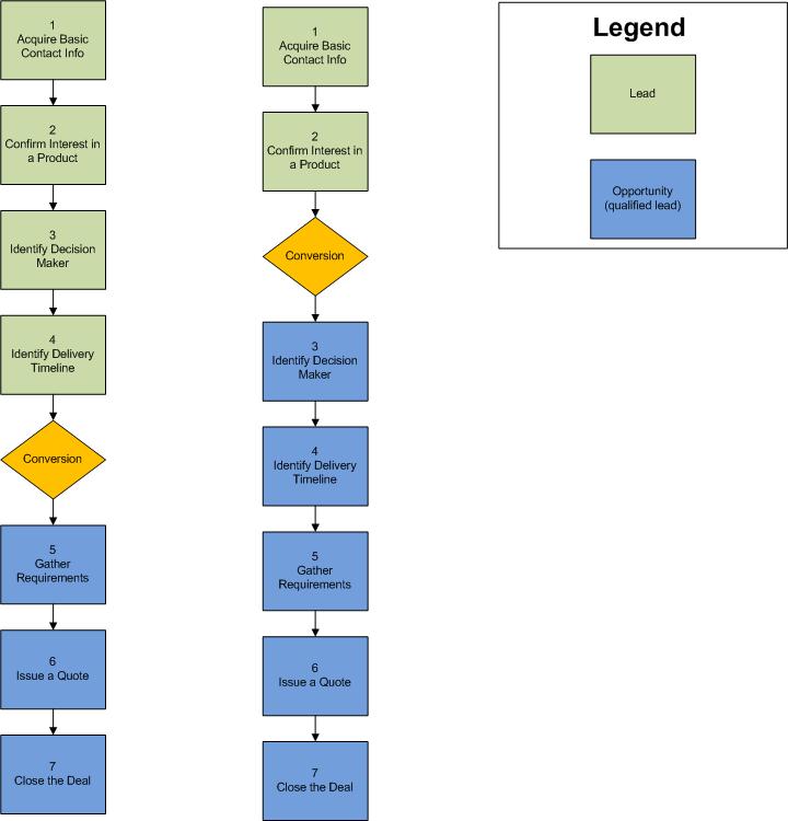 The below image shows this same sales process in two different companies, you’ll notice although they use the same qualification criteria, they convert the lead at different points. This can be for any number of reasons, such as having a large number of leads at the top of the funnel, or if a company has an unusually long & complicated sales process.