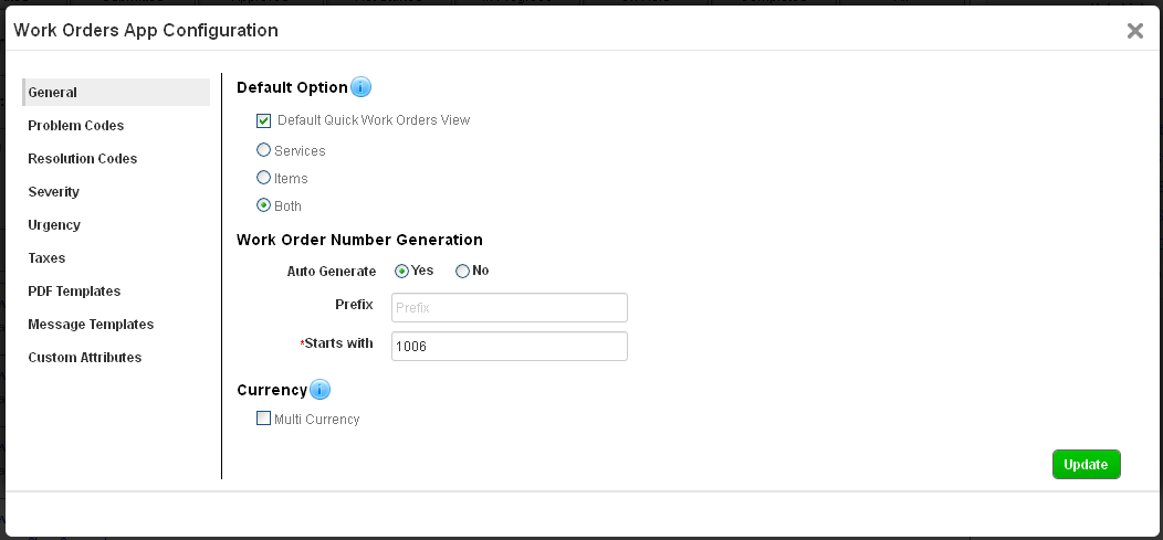 The first page that loads includes general settings for work order creation. These settings include whether work orders are billed by products/services, automatic work order id generation, and the ability to enable multiple currencies. Select your desired settings, and make sure to click the green “Update” button.