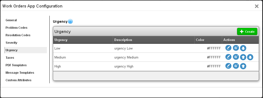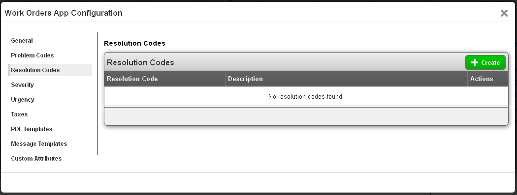 The next setting is “Resolution Codes”. This is where you can define the codes used to describe the type of resolution which was reached for this work order. Once codes are added here, they can selected when editing a work order.