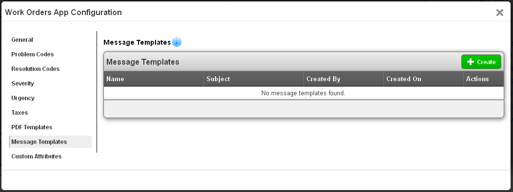 To assist in communicating to customers, the next setting is message templates. This feature allows you to set up pre-defined message that can be sent to your customers via email. Create a template here, and then you will have the ability to apply this template when creating an email activity.