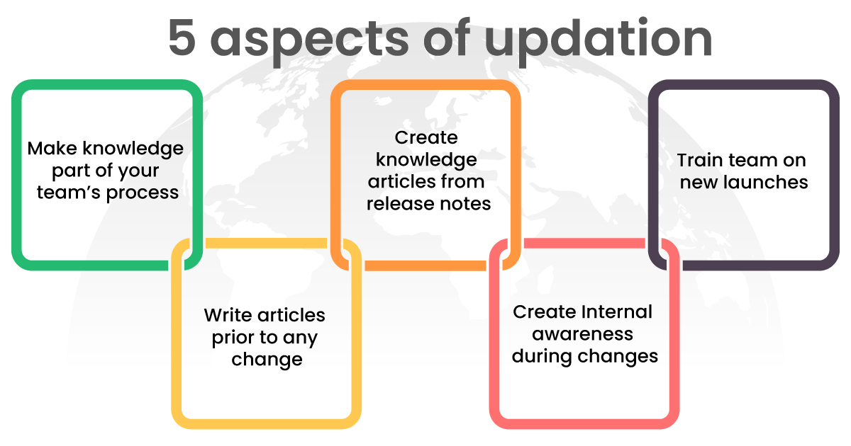 The toughest part of the knowledge base is creating one. However, it is equally challenging to keep it updated with the latest information and for that purpose, updating the knowledge base has been made part of the SOPs of relevant departments. Assign owners to various Topics, Sections, Information, Guides, etc. and make it their responsibility to keep that information updated. This is even more challenging than creating a knowledge base. Because everyone is constantly preoccupied with their own KPIs and focused on delivering them, updating the knowledge base sometimes gets relegated to documentation-level priority and fails to be updated.