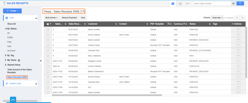 Maintaining the summary of records helps businesses to analyze the progress of their data in less time. It would be easy for you to keep track of your records frequently. Summary boxes will provide the summary of records in sum, count, and average. Create your own view with summary boxes and get the view on the left panel view. You can create up to six summary boxes by providing different criteria to meet the needed scenarios and get insight into your sales receipts. Read More