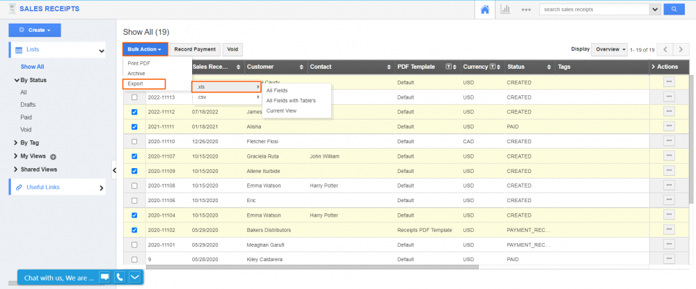 Sales receipts serve as verification of payment. Record the sales receipts of your customers and export them. Till now, you could get the PDF version of sales receipts using the Print PDF on the overview page. There might be situations where you would like to perform the bulk export and share them with your customers or employees. Now you can perform the bulk export action and get the records in XLS and CSV formats. Read More