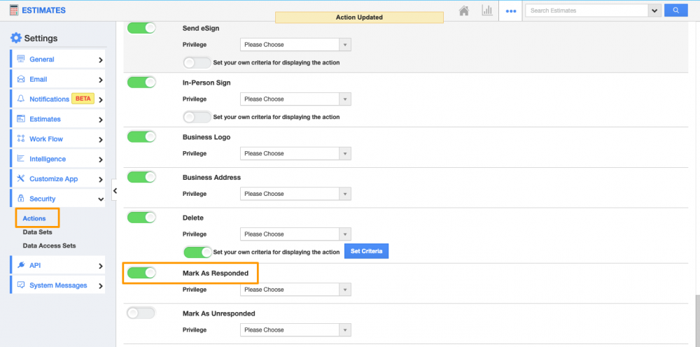 Apptivo Security actions allow users to manage the actions to be performed by the other users. We have implemented the “Mark as Responded/Unresponded” button actions for Estimates app in this update. You can manage these actions on the Estimates app by enabling and disabling this action toggle. Once the estimates are created and sent to your customer, the Mark as Unresponded button will be visible on the estimate’s overview page. As soon as the estimate is marked as unresponded, the mark as responded button will be visible. You can also set the privileges for these actions to be visible based on your business preferences. Read more.