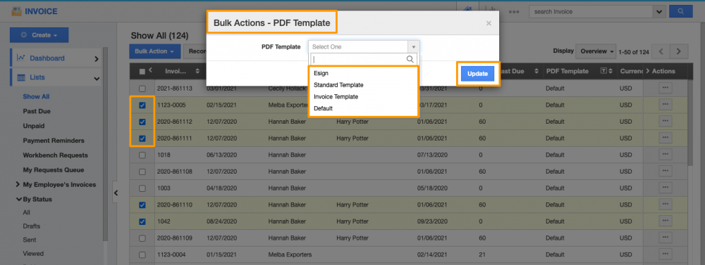 PDF Template Bulk Update in Invoices