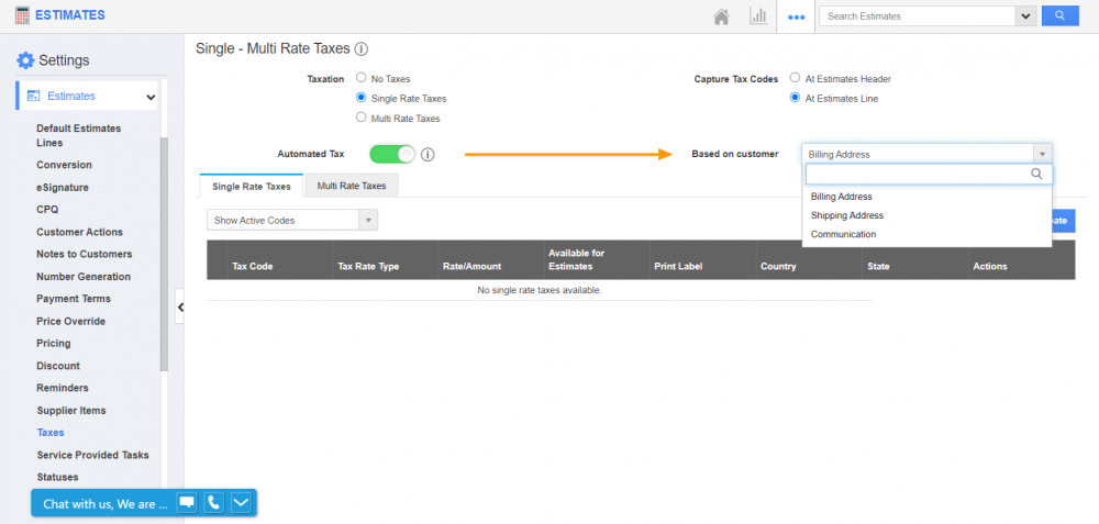 Apptivo’s Estimates app is now enhanced for businesses to add tax on products and services based on customer location. Therefore, each State’s tax value can be configured, and the tax can be levied accordingly. This includes both single rates as well as multi-rate tax structure. Depending on the setup, you can build the tax code on line and header levels. This applies to both percentage and fixed values of tax rates. At present, this feature is supported for the states in the US and Canada. Read more.