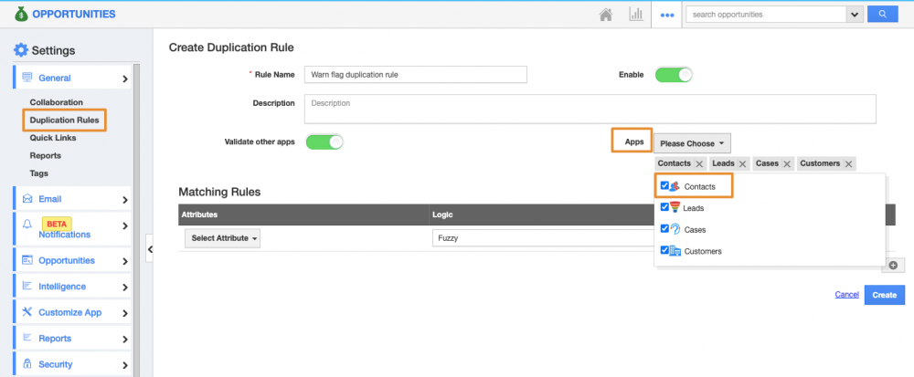 Duplication Rules in Apptivo mainly allow users to eliminate duplicating records and help to get only valid information inside the system. We have further improved the validation process and now the system additionally validates across other CRM applications as well based on the user preference. Users may set the rule either to Prevent Duplication automatically or Warn and Flag Duplication for review when creating or uploading a record in any of the CRM applications. The system validates the data across the other chosen applications and opts out the duplicate records with the application details. Click here to learn more.