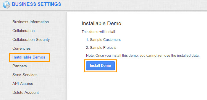 An installable demo is an Apptivo feature that allows you to automatically create example customers, employees, and projects. This feature is great for new users who are looking to test Apptivo features, or learn how Apptivo can be used for their business.