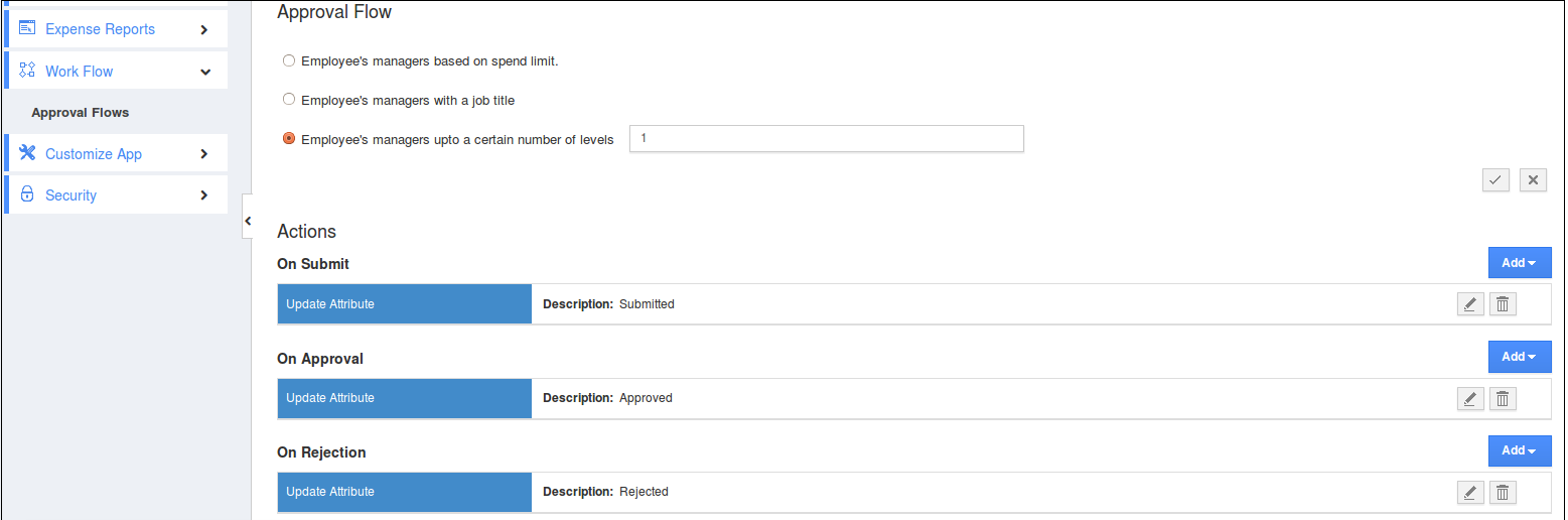 The Approval process is mandatory in generating the expense reports. Which will help the manger to know whether the expenses are carried out correctly by their employees or not. Here, you can customize your own approval process according your company profile. You can also create a criteria, approval flow and the status, if you do not want the approval to be done on your expense report you can turn off the same. Below is the screenshot on how to create your own approval flow,