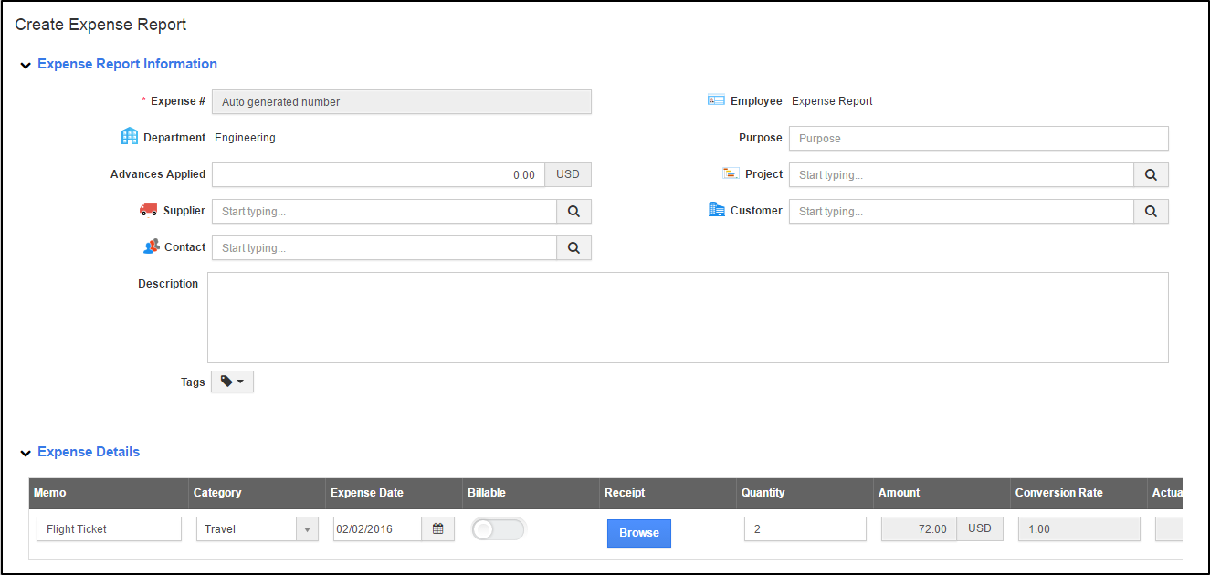 To save your Expense reports without any hindrance, you can set categories. Wherein you can create category for the expenses, also you can create the amount type like single amount, quantity based tracked expense and itemized expenses.