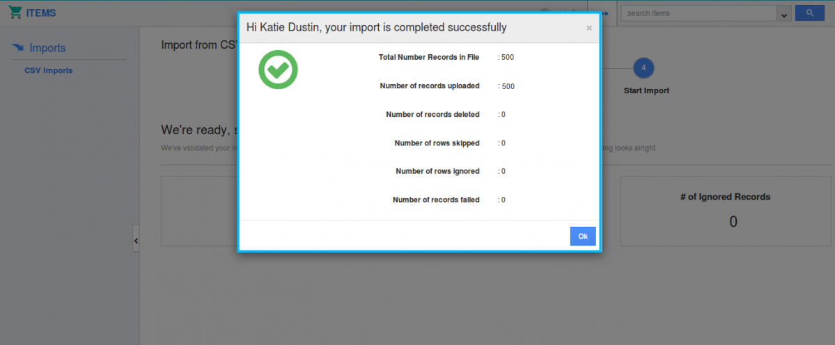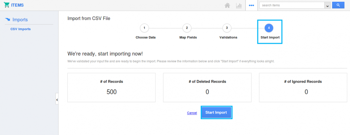 - Finally the page will show number of #of Records, #deleted records and #of ignored records and click on “Start Import”.