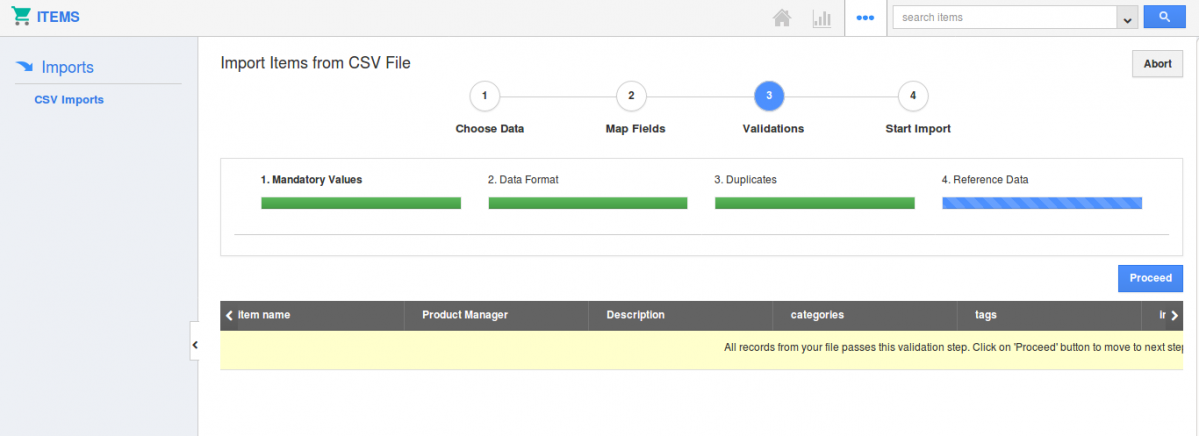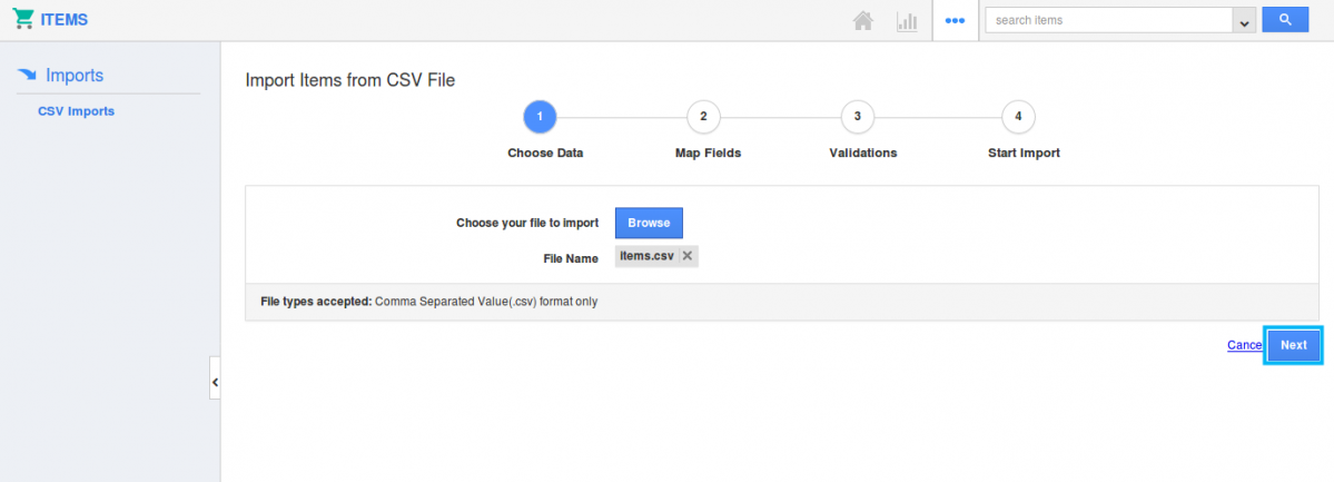 - Map items fields to respective CSV field as shown in the below instance. Make sure to map the custom items mandatory fields.