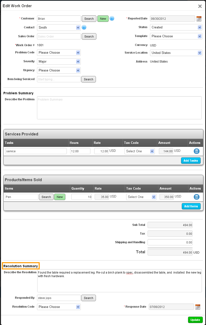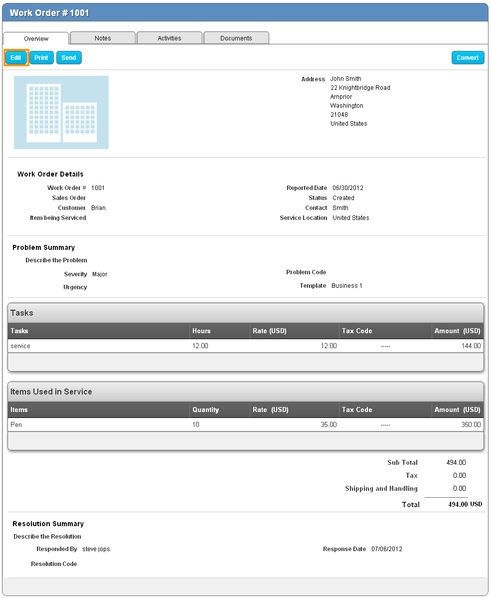 Before closing out and billing for the work order, make sure you have added all of the tasks and materials used during the work.Once all of your information is properly logged to the work order, it’s time to resolve it. To do this, click on the “Edit” button found in the upper right corner when viewing the work order.