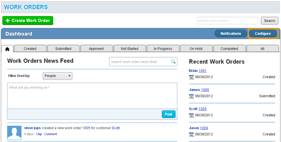 First, you’ll need to log in to Apptivo, then navigate to the Work Orders App under the CRM category. Then click on the “Configuration” button in the upper right corner of the page.