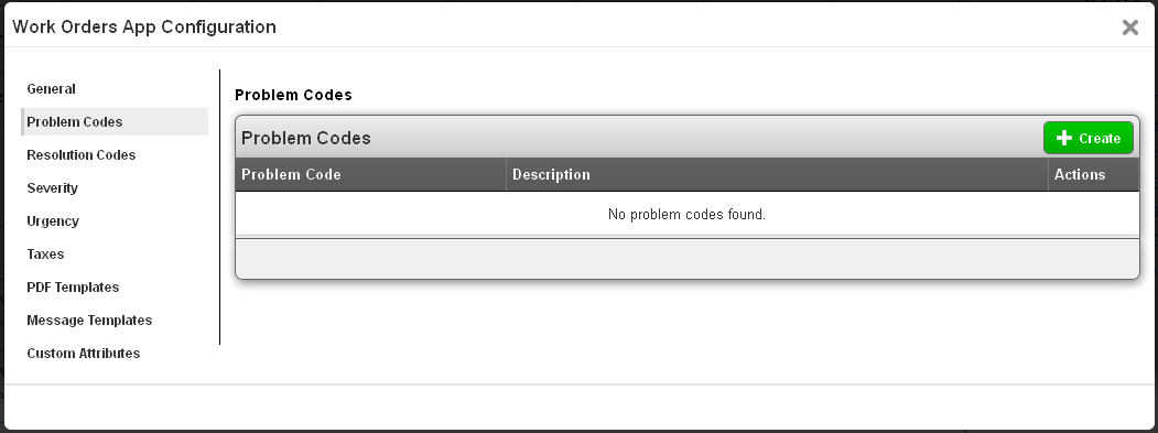 The next setting is “Resolution Codes”. This is where you can define the codes used to describe the type of resolution which was reached for this work order. Once codes are added here, they can selected when editing a work order.