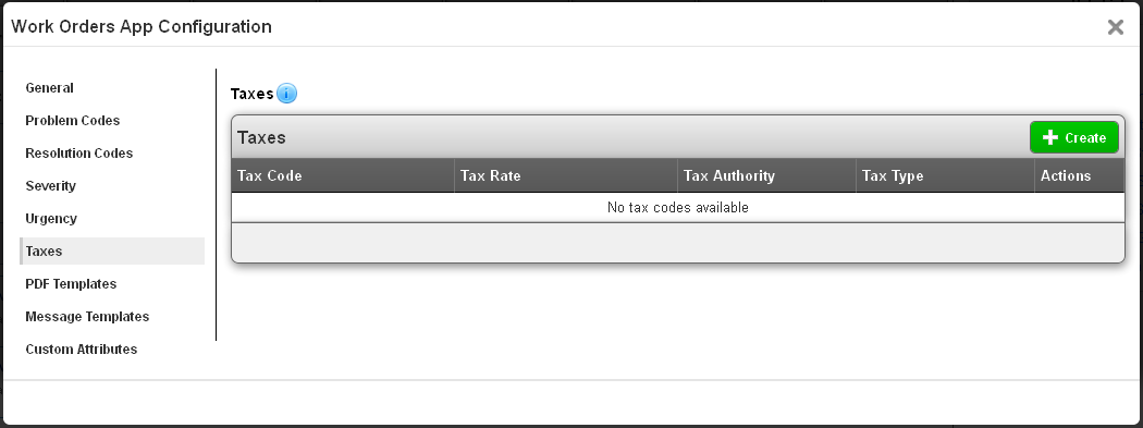 Next is your taxes. This is where you configure tax codes, which allow you to apply sales, use, and other taxes to the services and products in your work order. These tax codes will be shared with your Invoices and Estimates apps.