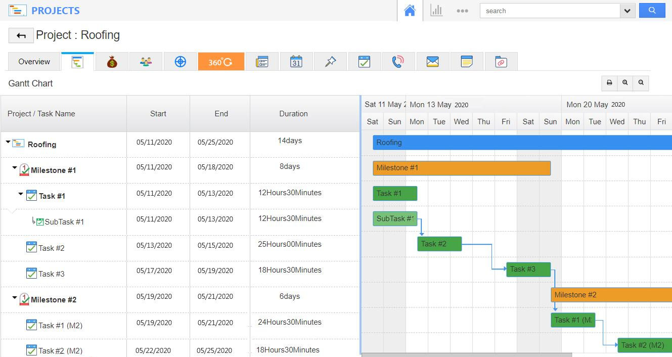 A Study has shown that there is a 13% increase in productivity when the employees are happy and satisfied. This sense of satisfaction is created by Milestones. As employees complete each milestone and report their success, they are motivated to work harder and increase the success rates. The Gantt Charts of Apptivo is one of the best project monitoring features displaying precise data on Milestones with an advanced dashboard facility. The Gantt charts are available for individual projects and all projects together. They display the progress of the projects based on milestones and tasks along with the start date, end date, and duration of each activity.